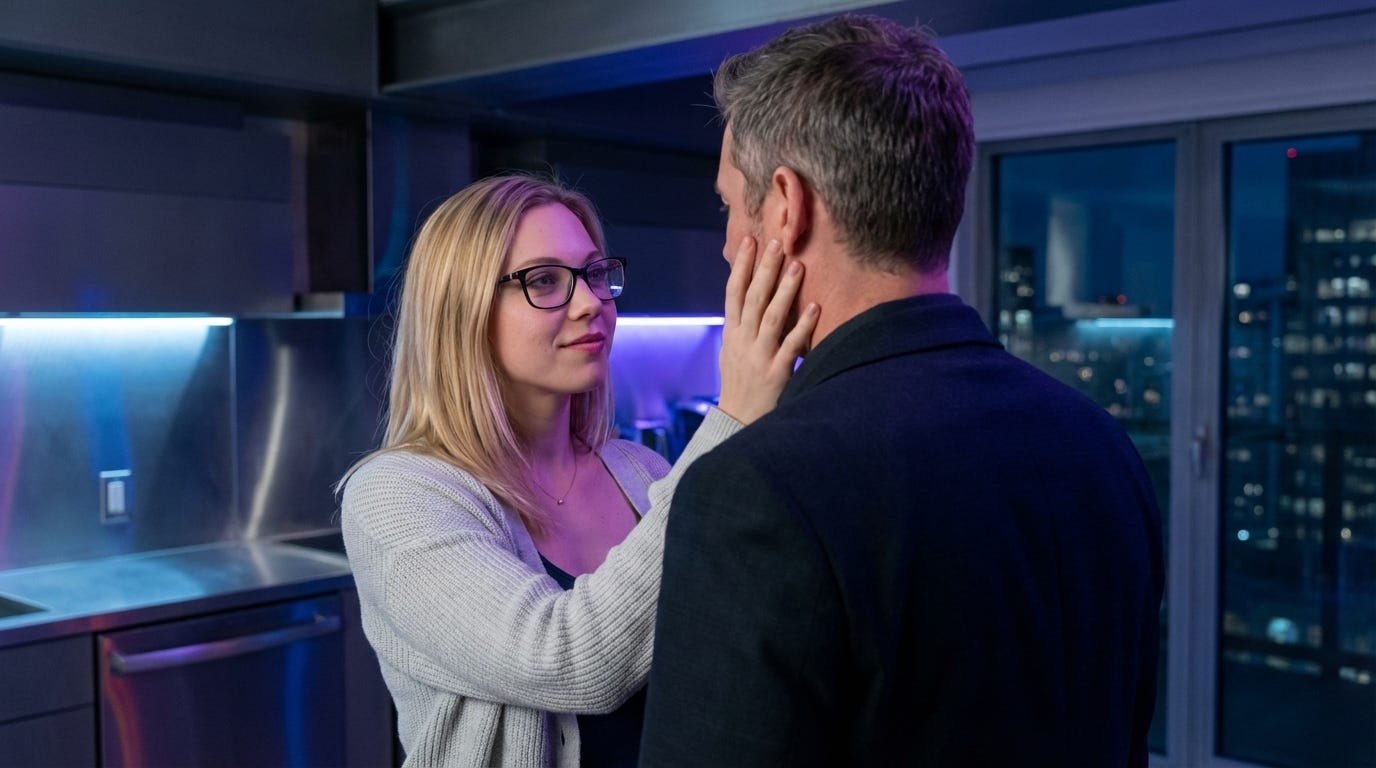 Her hydrogel palm finds the small of his back – pressure-mapped at 2.3 kPa, the exact threshold her tactile modeling identifies as grounding rather than intrusive. She feels the knot of tension in his lumbar through her subdermal receptors: a dense, involuntary bracing. She files it.