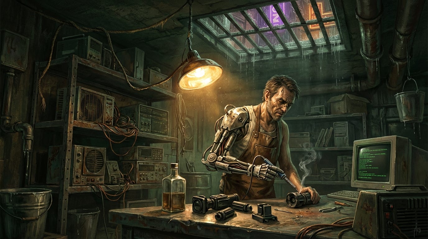 Vic rotated the wrist. A grinding noise, like gravel in a blender, but it moved. He didn’t have the scrip for a medical overhaul, and he sure as hell wasn’t going to a street doc who’d replace the Naval-spec servos with plastic consumer trash. He sat back down, picking up the pliers with a fresh grimace.